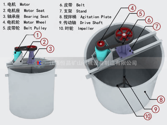 浮選藥劑攪拌桶設(shè)備主要由槽體、支架、電機(jī)、葉輪及傳動(dòng)軸等組成。由電動(dòng)機(jī)經(jīng)皮帶,葉輪軸帶動(dòng)葉輪旋轉(zhuǎn)進(jìn)行工作,礦漿和浮選藥劑在葉輪產(chǎn)生的離心力和升力作用下在槽內(nèi)循環(huán)運(yùn)動(dòng),從而使藥劑均勻在分布于礦漿之中。